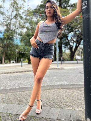 SAMARA — Short jean stretch taille haute bleu / blanc / noir (XS à XL)