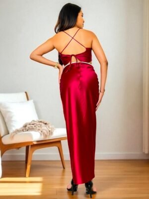 Robe de Soirée Longue Satinée Dos Nu avec Détails Argentés
